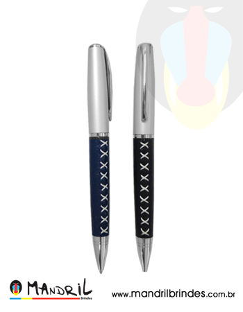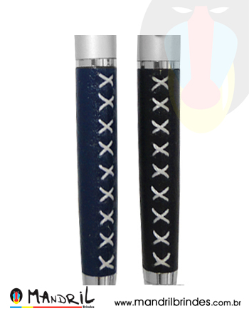Caneta de metal com couro sintético, detalhe em costura branca.