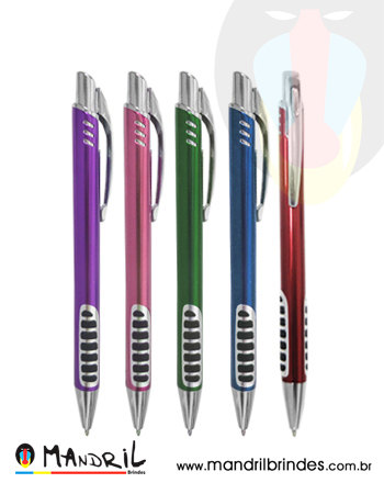 Caneta de metal com detalhe emborrachado.