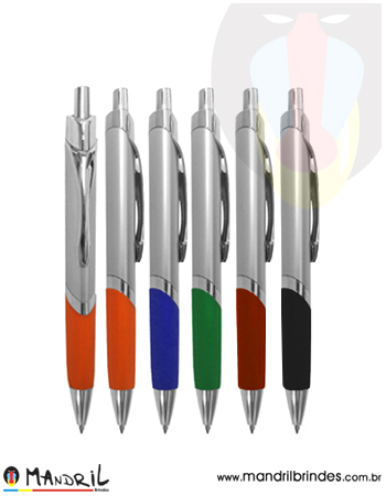 Caneta de metal com detalhe emborrachado.