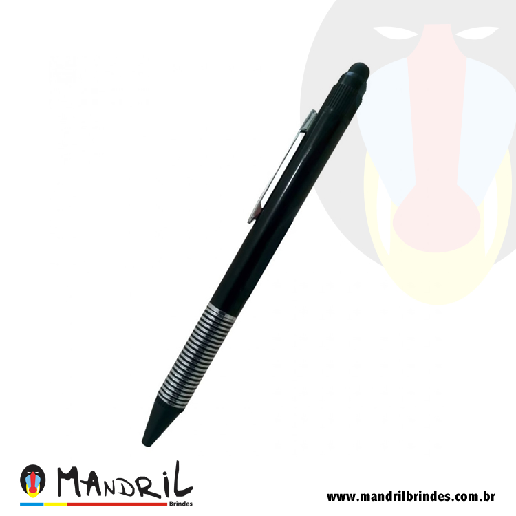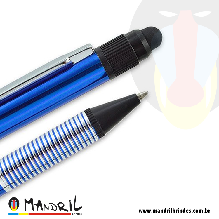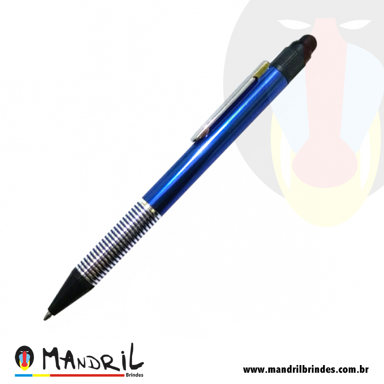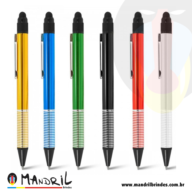 Caneta metal com touch, corpo colorido com detalhes prata e preto. Clip metal e borracha touch superior, possui vinte e dois anéis na parte inferior em formato espiral. Para acionar basta rotacionar o suporte em relevo do touch.