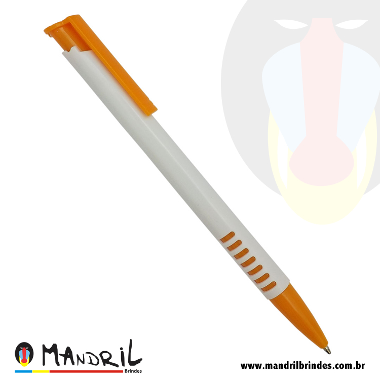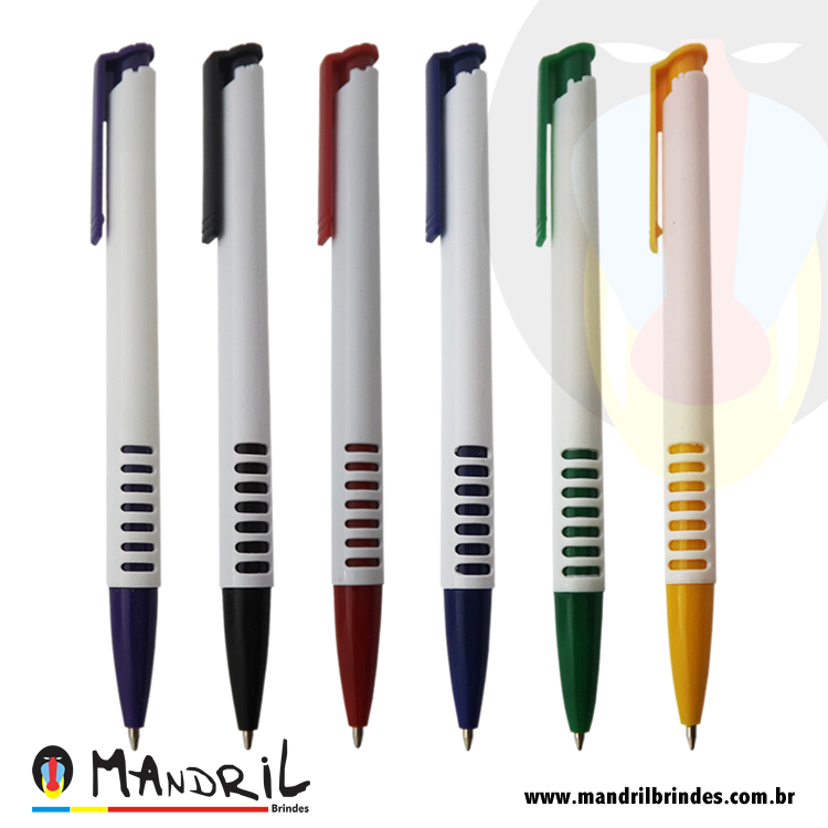 Caneta plástica corpo branco com detalhes coloridos. Clip plástico colorido e parte inferior com sete linhas coloridas. Aciona por clique.