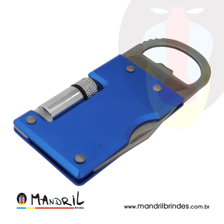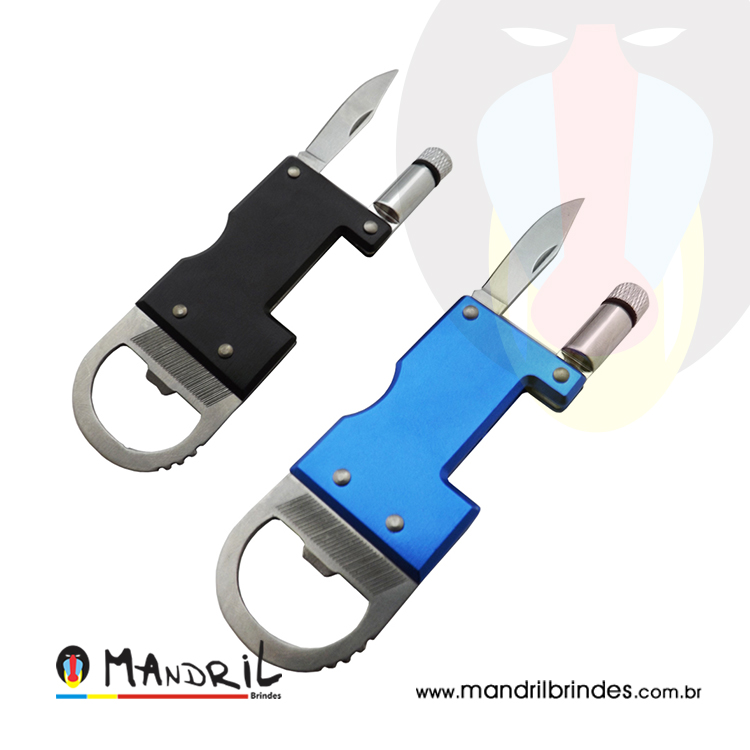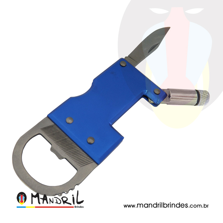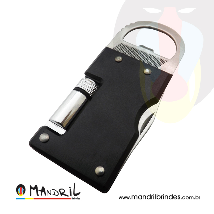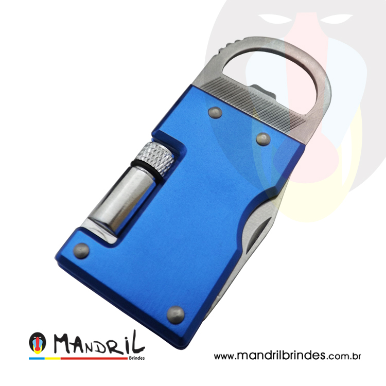 Chaveiro abridor com lanterna, de metal.