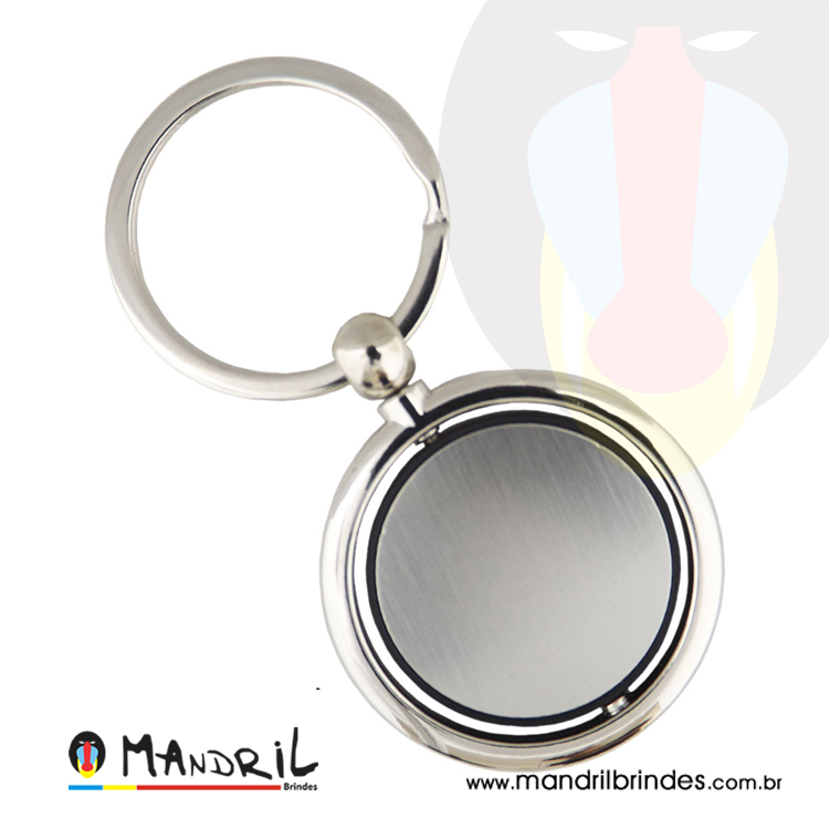 Chaveiro de metal giratório, com detalhe em prata escovado nas duas faces, em formato redondo.