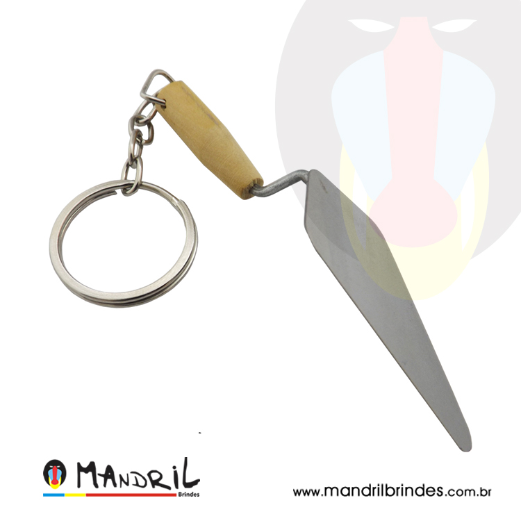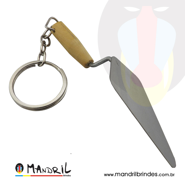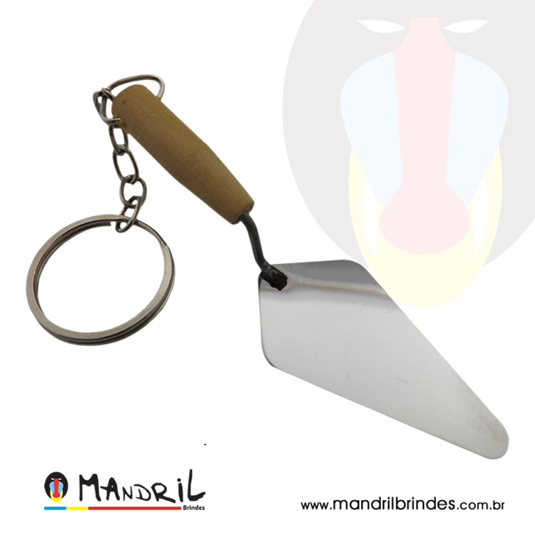 Chaveiro metal em formato de colher de pedreiro, com cabo de madeira.