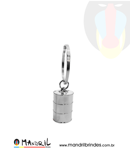 Chaveiro de metal em formato de barril.