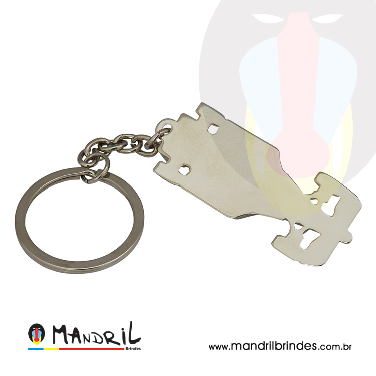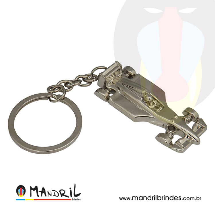 Chaveiro de metal, com formato de carro de Fórmula 1.