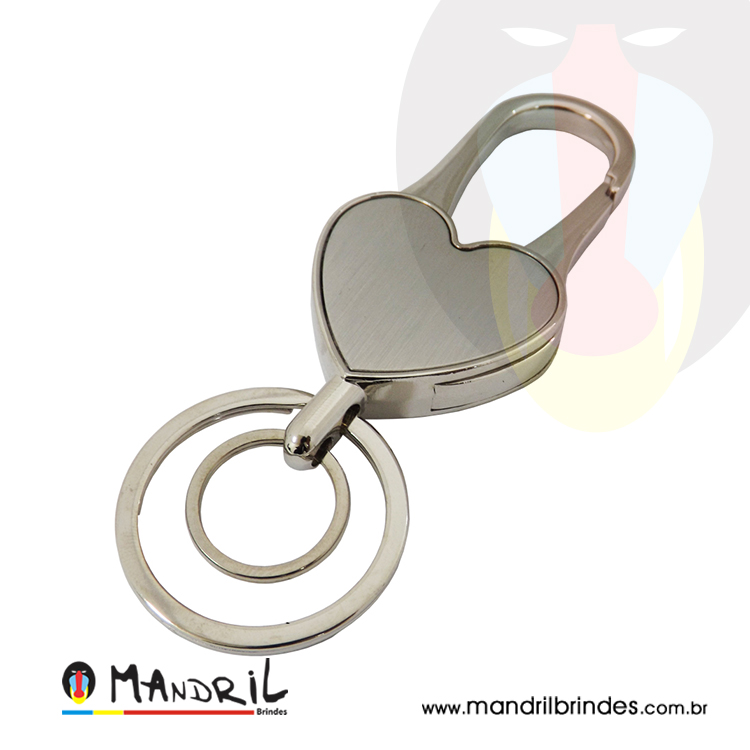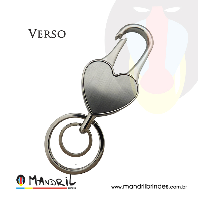Chaveiro metal em formato de coração com detalhe em prata escovado no verso, com duas argolas.