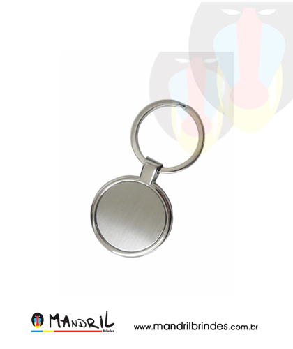 Chaveiro redondo de metal, com a parte detrás espelhada.