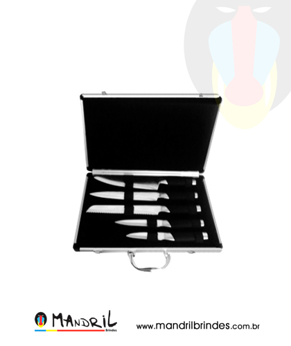 Jogo de facas com 5 peças, material de metal com detalhe emborrachado preto no cabo.