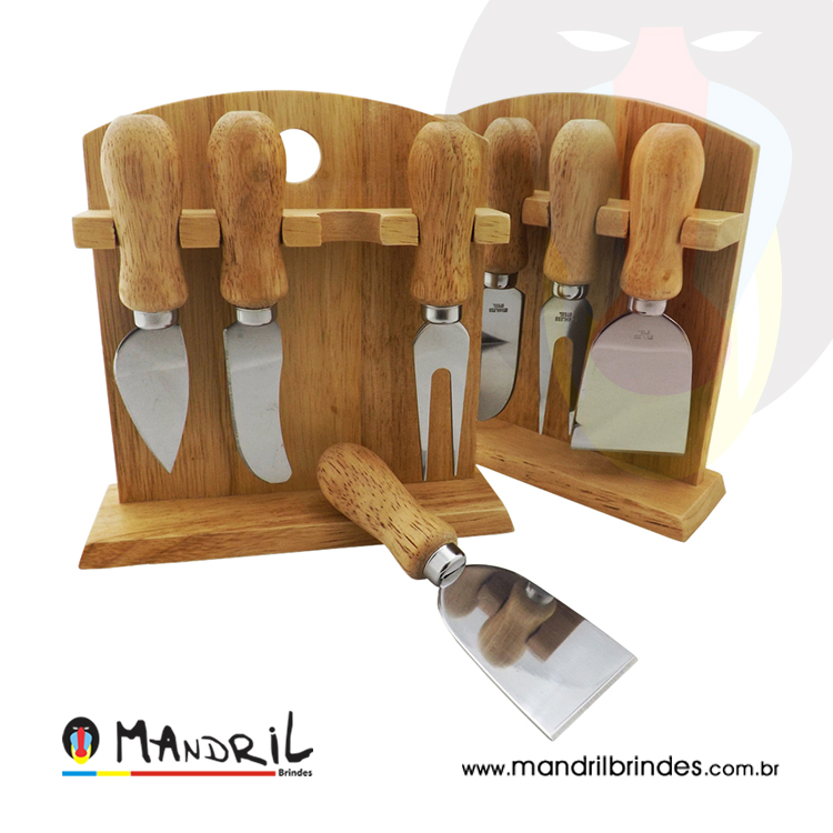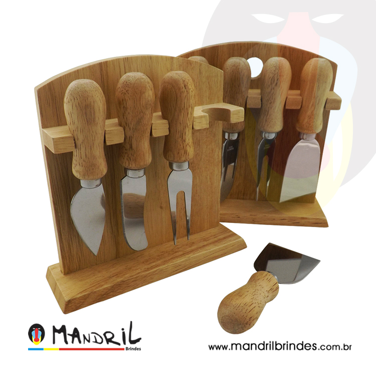 Kit queijo com 4 peças, suporte de madeira.