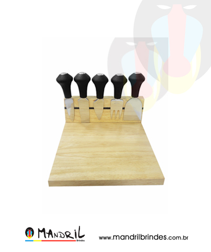 Kit queijo com 5 peças, base de madeira.